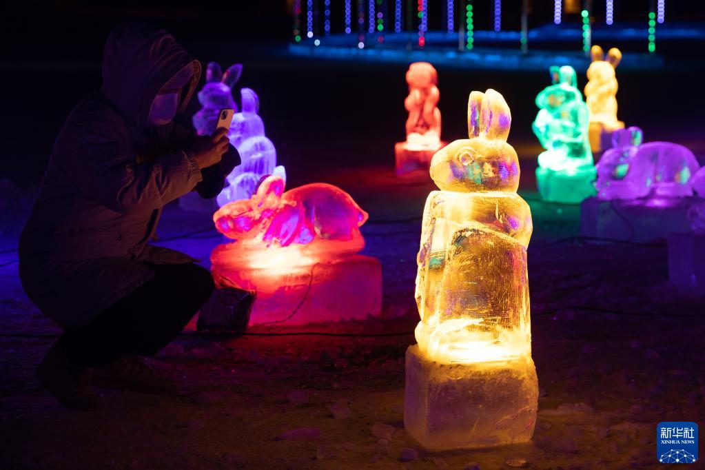 1月6日,游客在漠河市一處冰雪樂園拍照留念。