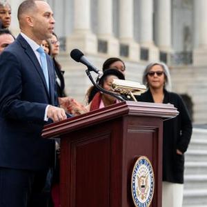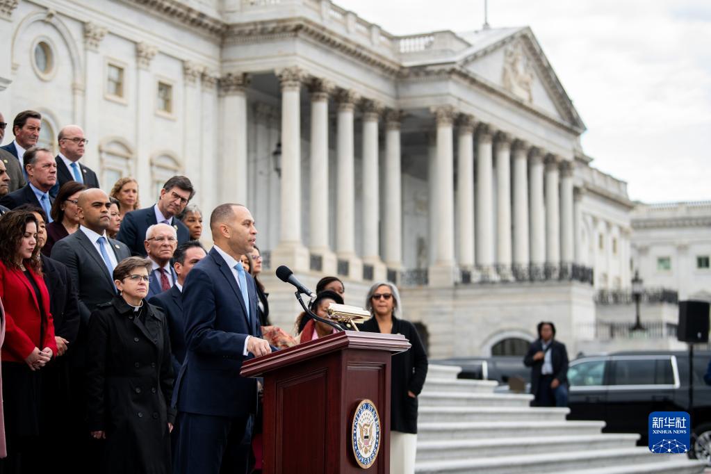 1月6日,在美國首都華盛頓的國會大廈外,國會眾議院成員等參加“國會山騷亂”兩周年紀念儀式。