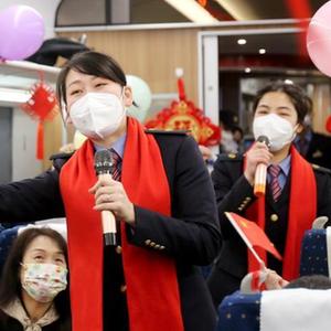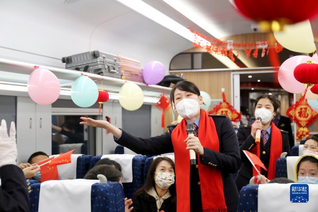 春運首日,在北京豐臺開往福州的D759次列車上,擔(dān)任乘務(wù)工作的中國鐵路南昌局集團有限公司福州客運段福京車隊的黨團員、青年骨干組成志愿者服務(wù)隊為旅客表演文藝節(jié)目、開展互動游戲,讓春運旅途充滿歡歌笑語。