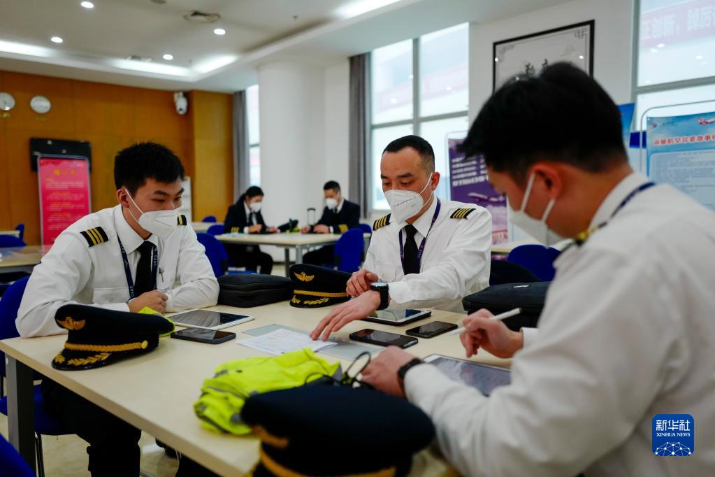 1月6日,重慶航空的機組工作區(qū)內,菅士博(右二)和妻子楊靜(后排左一)在不同機組進行飛行前的準備。