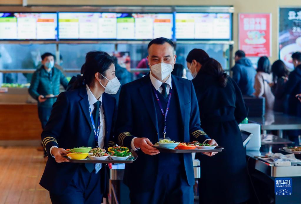 1月6日,重慶航空的食堂內,出任務的楊靜(左)和丈夫菅士博(右)邊打飯邊交流。