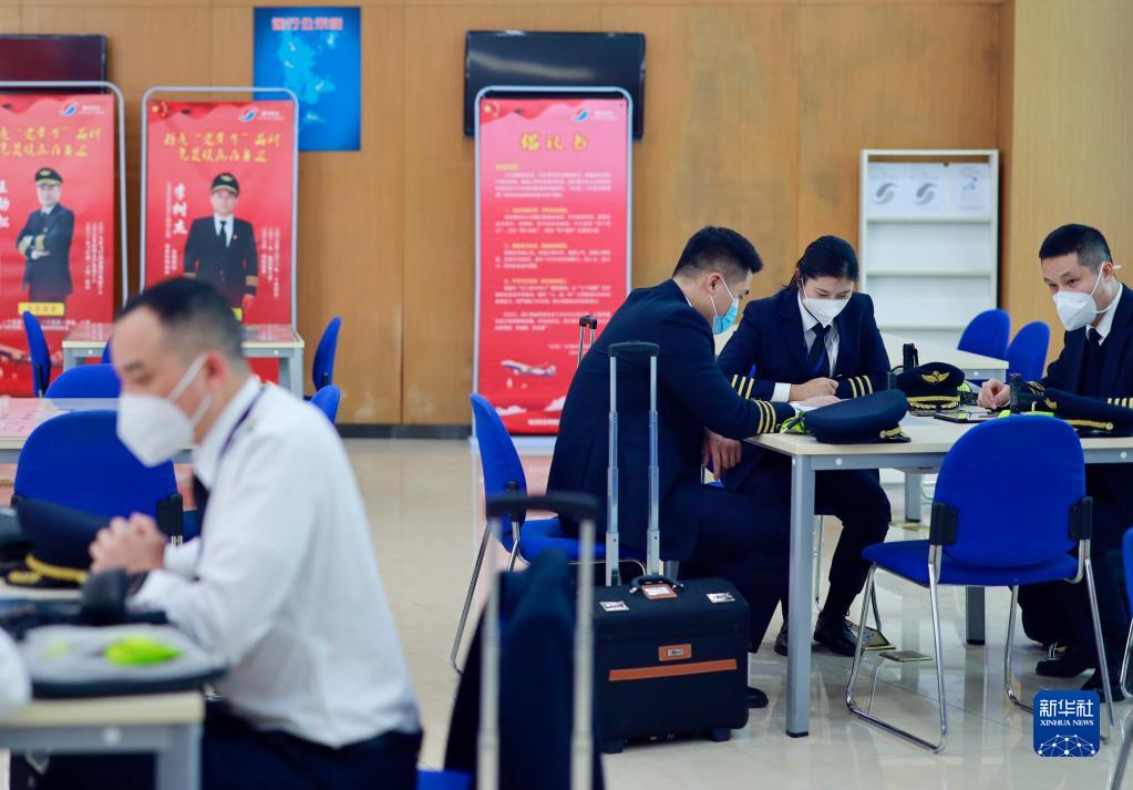 1月6日,重慶航空的機組工作區內,楊靜(右二)和丈夫菅士博(左一)在不同機組進行飛行前的準備。