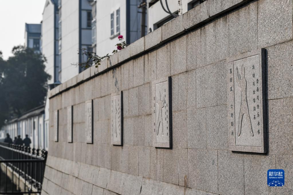在蘇州市姑蘇區(qū)二郎巷健康步道健康素養(yǎng)宣傳墻上展示的太極十八式石雕(1月6日攝)。
