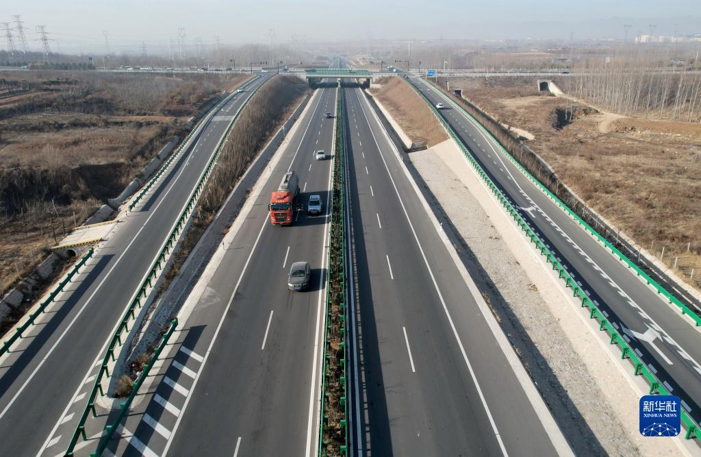 1月7日,車輛從秦皇島市海港區(qū)境內(nèi)的國(guó)道102線與民族北路互通立交橋上通過(guò)(無(wú)人機(jī)照片)。