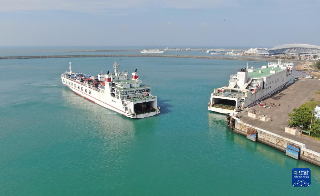 1月6日,在位于海口的粵海鐵路輪渡南港碼頭,粵海鐵1號輪渡正在停靠泊位(無人機照片)。