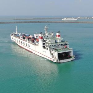 粵海鐵路輪渡是我國第一條跨海鐵路通道,跨越我國三大海峽之一的瓊州海峽。粵海鐵路輪渡于2003年1月7日開通營運,海上航線距離約12.5海里(相當于22.5公里),航行時間約60分鐘。現有四艘萬噸級渡輪,較大的兩艘總噸位達2.3萬噸。渡船下層甲板載運火車,中層甲板載運汽車,上層艙室載運旅客。