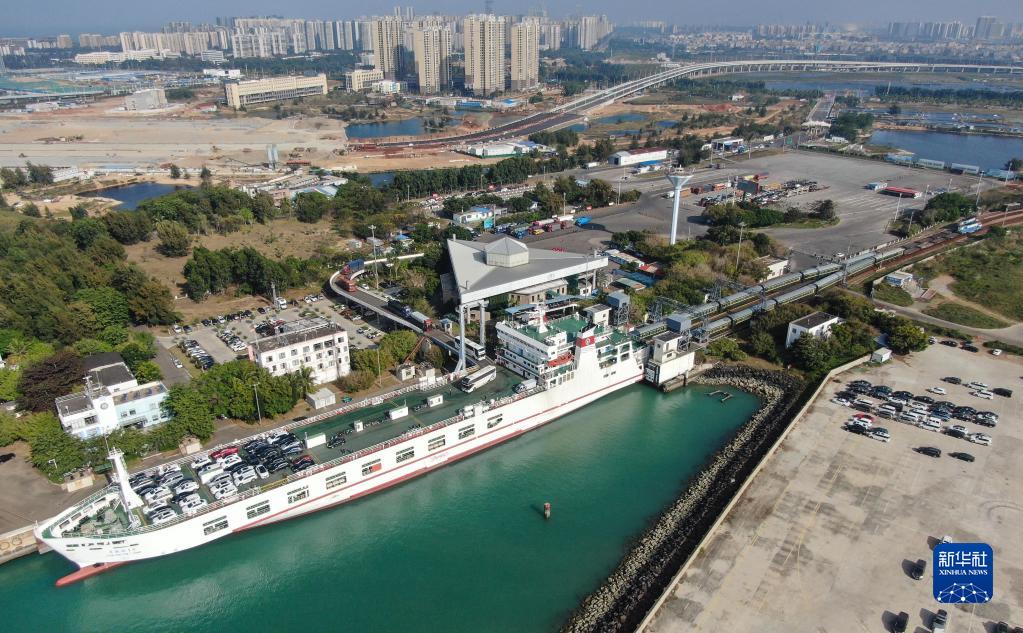 1月6日,在位于海口的粵海鐵路輪渡南港碼頭,粵海鐵1號輪渡停靠泊位并裝載列車(無人機照片)。