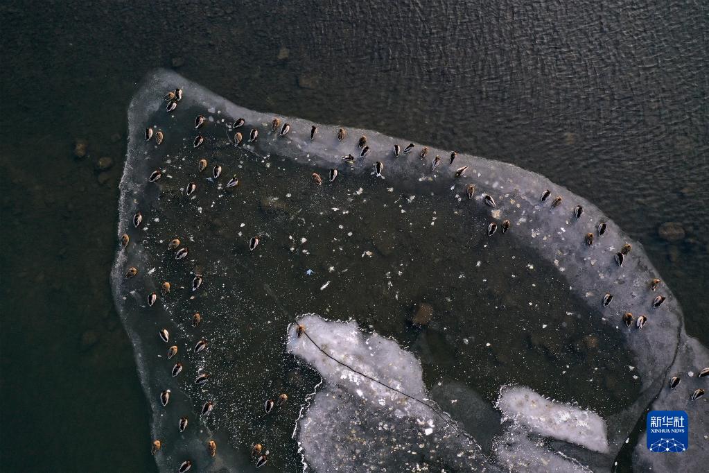 1月5日,候鳥在沈陽渾河棲息、覓食(無人機照片)。