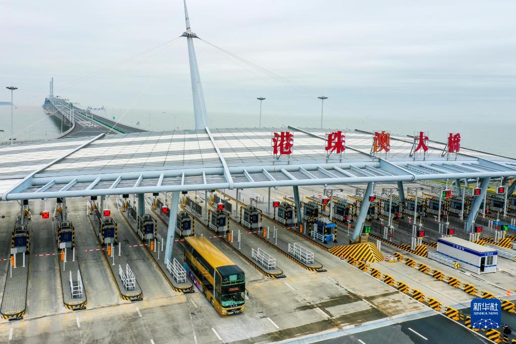 1月8日,一輛從香港開往珠海的港珠澳大橋穿梭巴士入境珠海(無人機照片)。