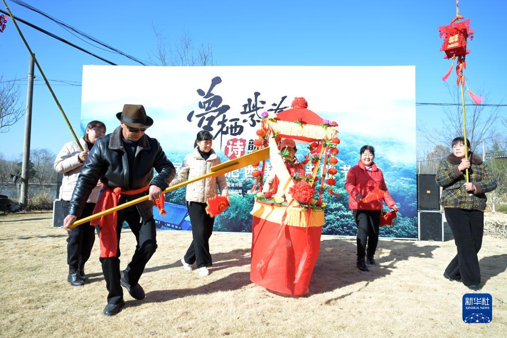 1月8日,民間藝人在第十屆中國·肥西紫蓬詩歌節線下活動上表演“劃旱船”。