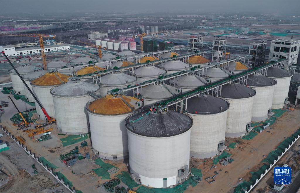 1月8日,工人在中央儲備糧秦皇島直屬庫有限公司海港糧食儲備基地項目建設工地施工(無人機照片)。