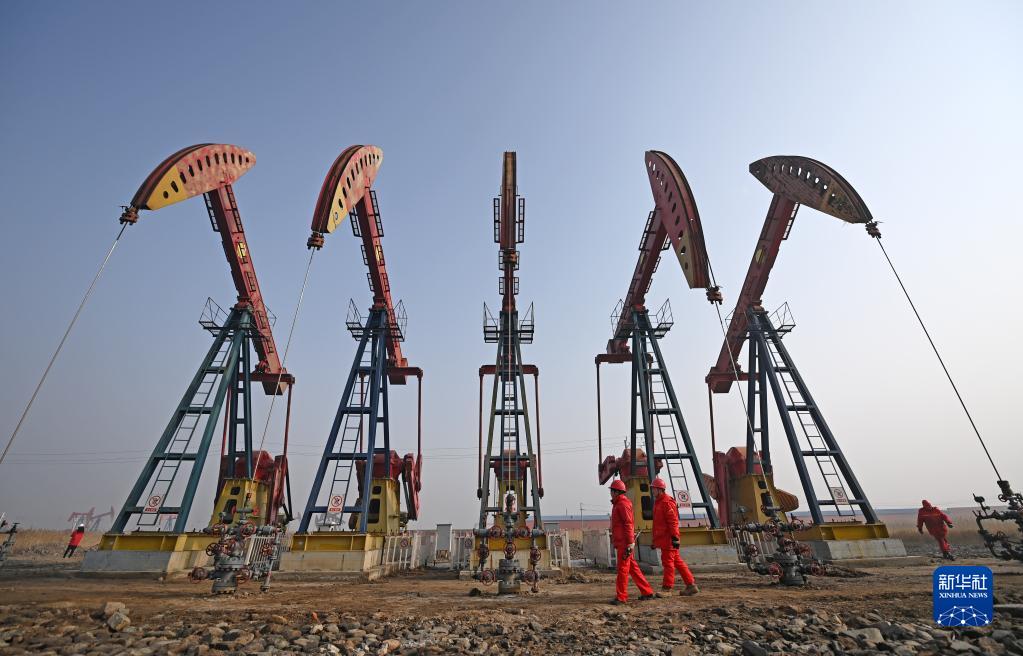 尤立紅(左)和同事在大港油田第五采油廠第一采油作業區內巡檢(1月6日攝)。
