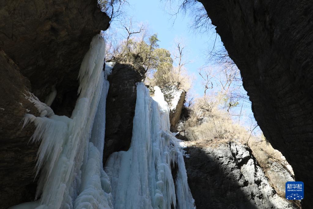 這是1月8日拍攝的官鵝溝景區(qū)冰瀑景觀。