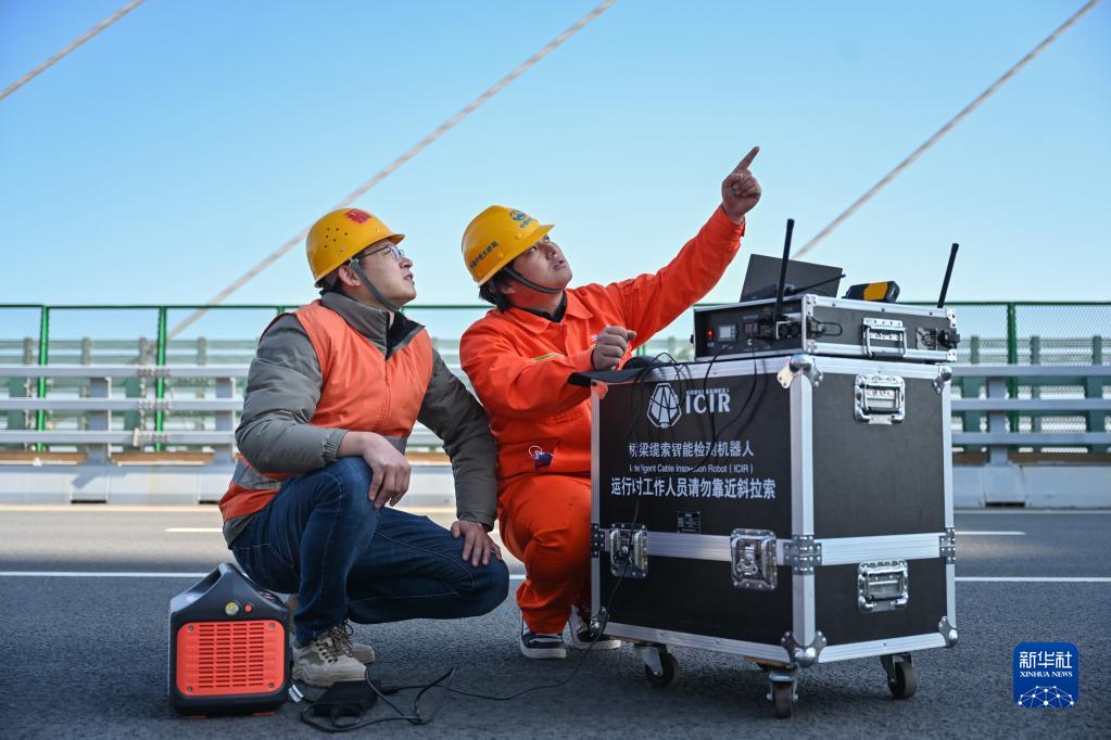 1月8日,在福建平潭公鐵兩用跨海大橋,福州工務段工作人員在分析橋梁纜索智能檢測機器人作業數據。