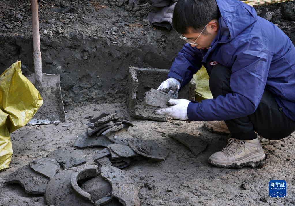 考古工作人員在河南商丘宋國故城遺址發掘現場收集出土的陶器(1月6日攝)。