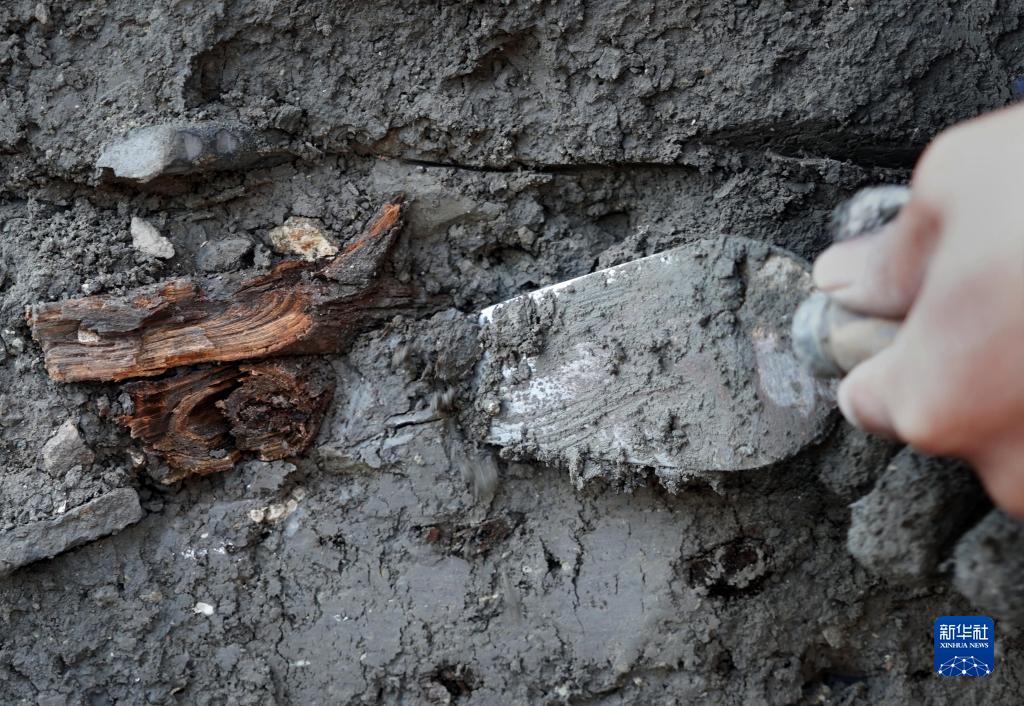 考古工作人員在河南商丘宋國故城遺址發掘現場清理地層剖面上的柏木(1月6日攝)。