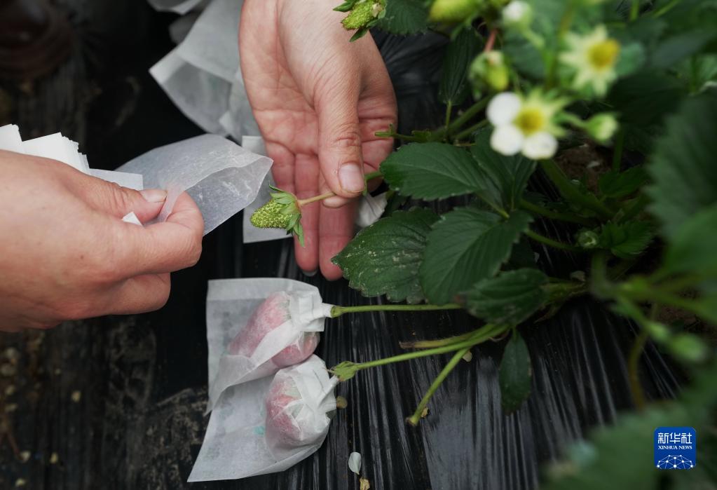 1月9日,盧龍縣劉田各莊鎮(zhèn)山善莊村一家庭農(nóng)場(chǎng)的員工在大棚內(nèi)給草莓套袋。