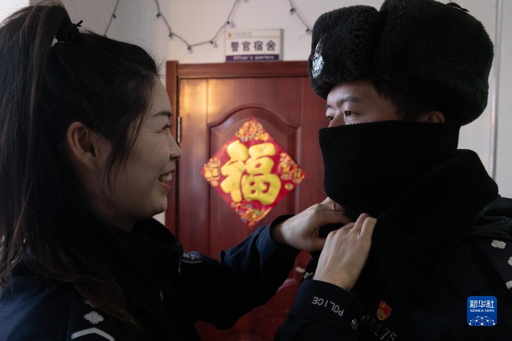 1月8日,在洛古河夫妻警務室,沈欣給即將去江面巡邏的史先強整理服裝。