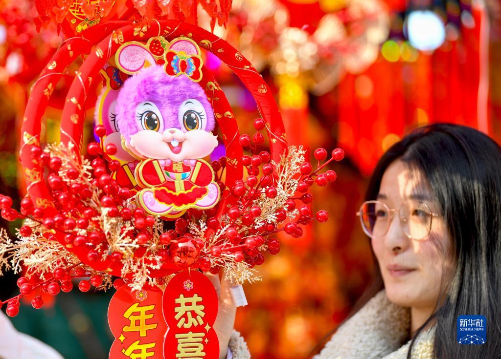 1月9日,市民在安徽省亳州市譙城區一家年貨市場選購新春飾品。