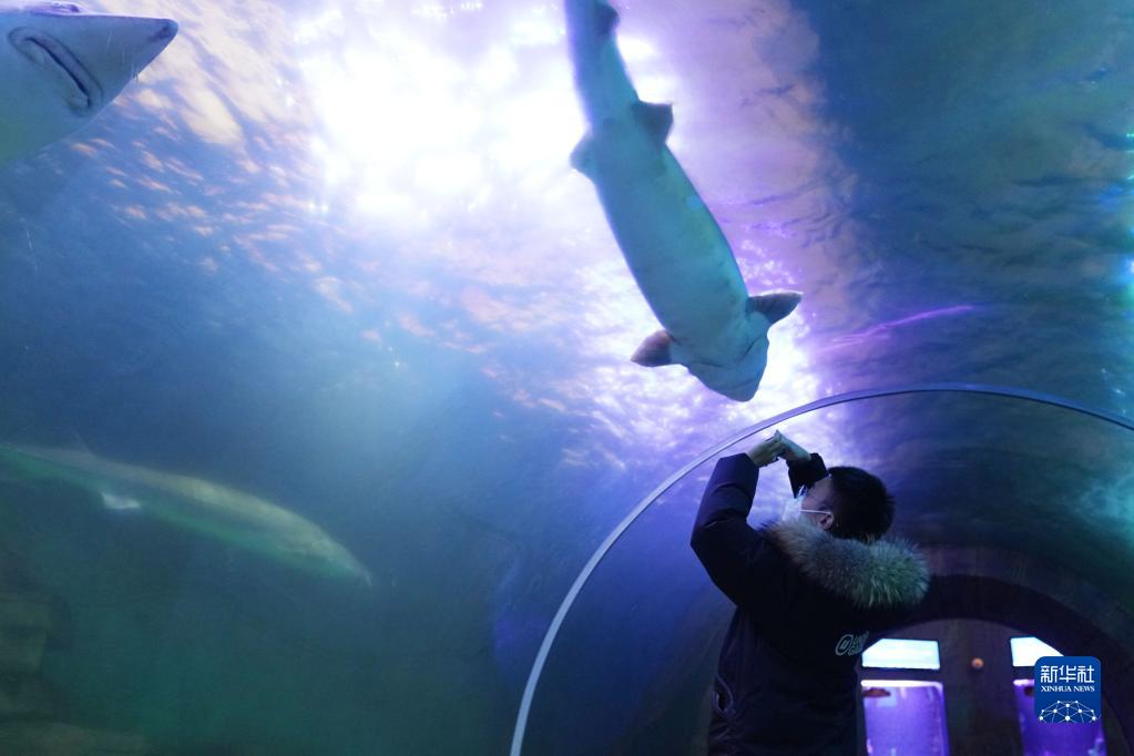 1月9日,參觀者在撫遠市魚博館參觀。