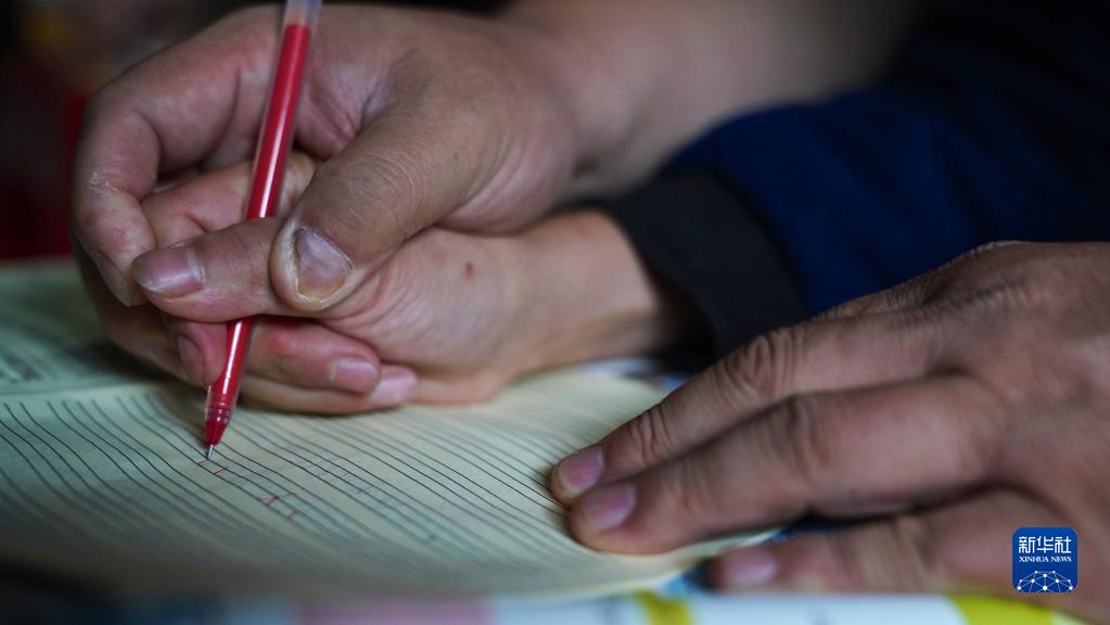 2022年5月28日,江西省宜春市袁州區洪塘鎮豐頂山中心小學校長韓富在一名學生家中糾正其握筆的姿勢。該校是一所寄宿制小學,學生60%都是留守兒童。