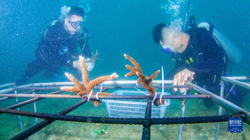 2022年6月7日,海南省海洋與漁業科學研究院的專家和分界洲島旅游區工作人員在海南省陵水黎族自治縣分界洲島附近海域移植珊瑚。