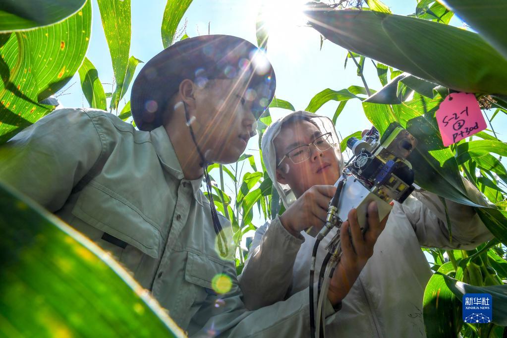 2022年8月17日,在吉林省梨樹縣,“90后”在讀博士生沙野(右)和崔帥在試驗田里測量玉米光合作用。