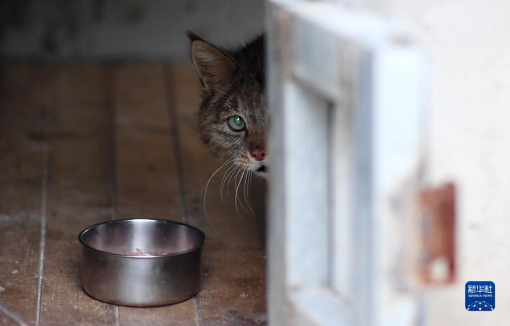 2022年9月18日,受救護的荒漠貓在青海野生動物救護繁育中心準備進食。