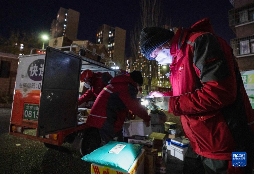 2022年12月15日,在北京市大興區新源時代小區,從西安赴京支援的快遞小哥王選軍(前)、齊帥龍(后左)和高興興按照樓號分貨。