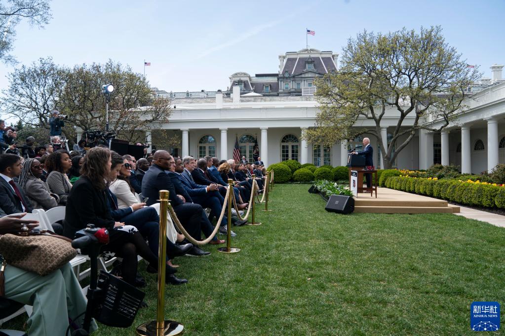 2022年4月11日,美國總統(tǒng)拜登(右一)在華盛頓白宮就監(jiān)管“幽靈槍”的新規(guī)發(fā)表講話。美國聯(lián)邦政府當(dāng)日出臺新規(guī),著眼監(jiān)管無編號且難以追蹤的“幽靈槍”。2022年,美國有近4.4萬人死于槍支暴力。