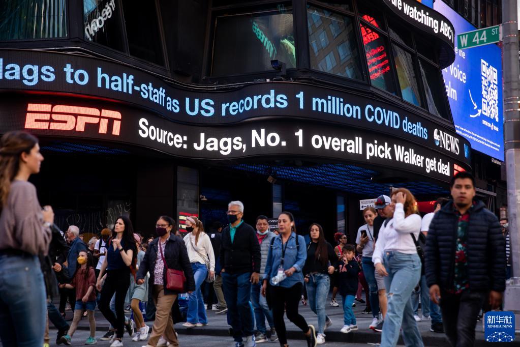 2022年5月12日,美國紐約時報廣場的電子屏上播放關于新冠死亡數字的新聞。美國當日宣布已累計有100萬美國人死于新冠疫情。