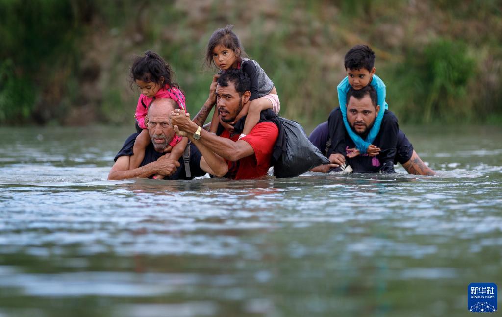 2022年7月25日,3名移民馱著兒童穿越美國得克薩斯州伊格爾帕斯附近的美墨界河格蘭德河,試圖進入美國。