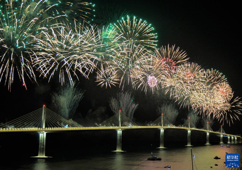 2022年7月26日,克羅地亞科馬爾納燃放焰火慶祝中克共建“一帶一路”標志性項目佩列沙茨大橋通車。