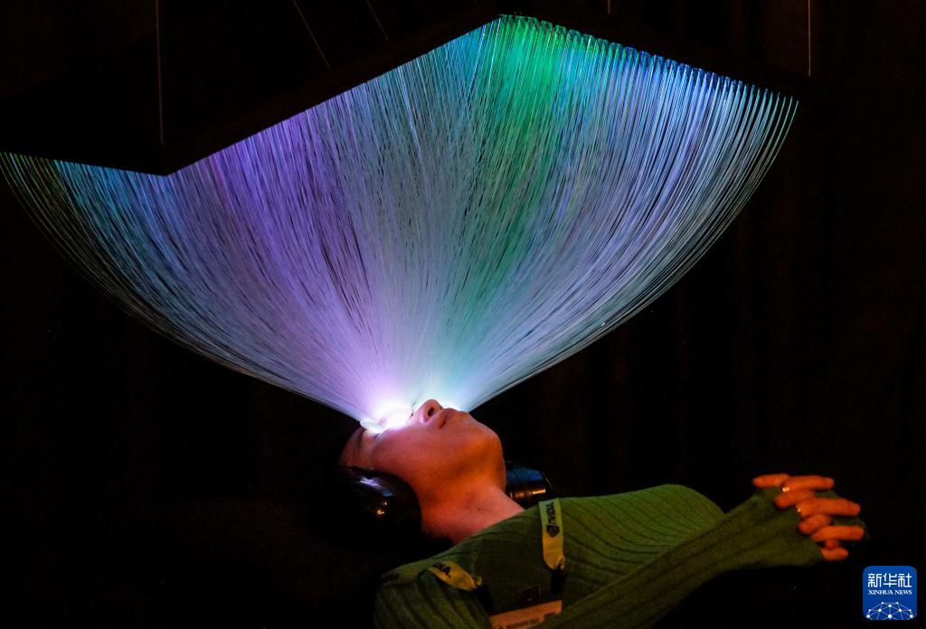 2022年8月9日,在加拿大溫哥華舉行的2022國際計算機協會圖形圖像學會年會上,參觀者體驗一款可將顏色與光線通過光纖投射到眼瞼上的設備。