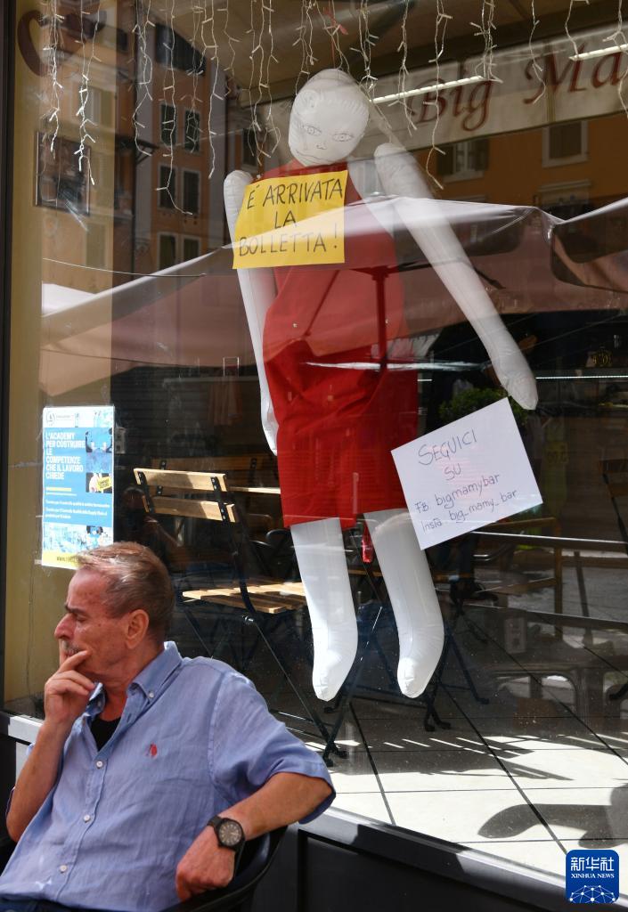 2022年9月17日,意大利羅馬一家餐館擺出人偶和“賬單已到!”字樣的紙牌,以此表達對餐館收到的高額電費賬單的不滿。受歐洲能源危機影響,意大利經營者和民眾的能源支出普遍上漲,不堪重負。