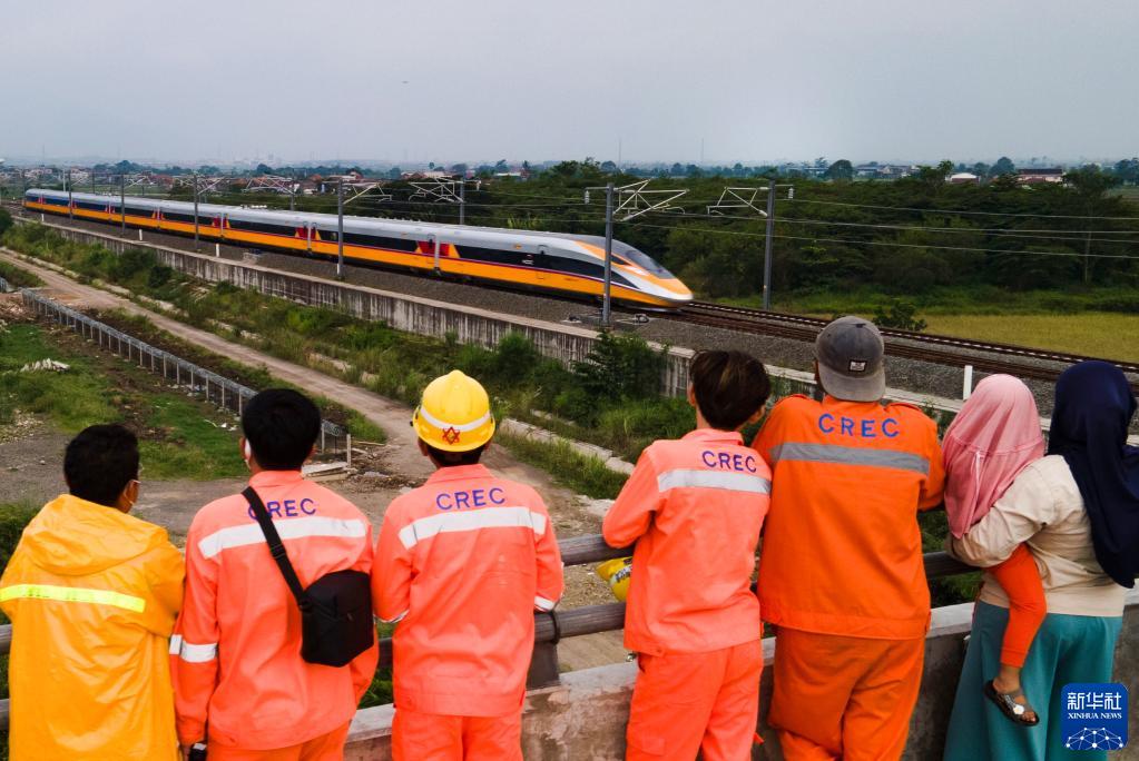 2022年11月16日,在印度尼西亞萬隆,雅萬高鐵建設(shè)者和當(dāng)?shù)孛癖娪^看高速鐵路綜合檢測車行駛在雅萬高鐵試驗段(無人機照片)。高速鐵路綜合檢測車當(dāng)日對雅萬高鐵德卡魯爾車站至4號梁場間線路進行了全面檢測,獲取的各項指標(biāo)參數(shù)表現(xiàn)良好。
