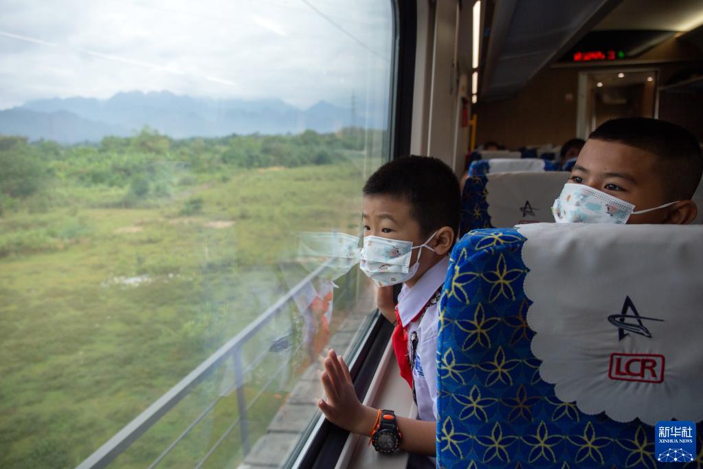 2022年12月1日,中老友好農(nóng)冰村小學(xué)的學(xué)生乘坐“瀾滄號”動車組欣賞中老鐵路老撾段沿線風(fēng)光。中老鐵路全長1035公里,于2021年12月3日開通運營,是“一帶一路”倡議與老撾“變陸鎖國為陸聯(lián)國”戰(zhàn)略對接的重要項目。