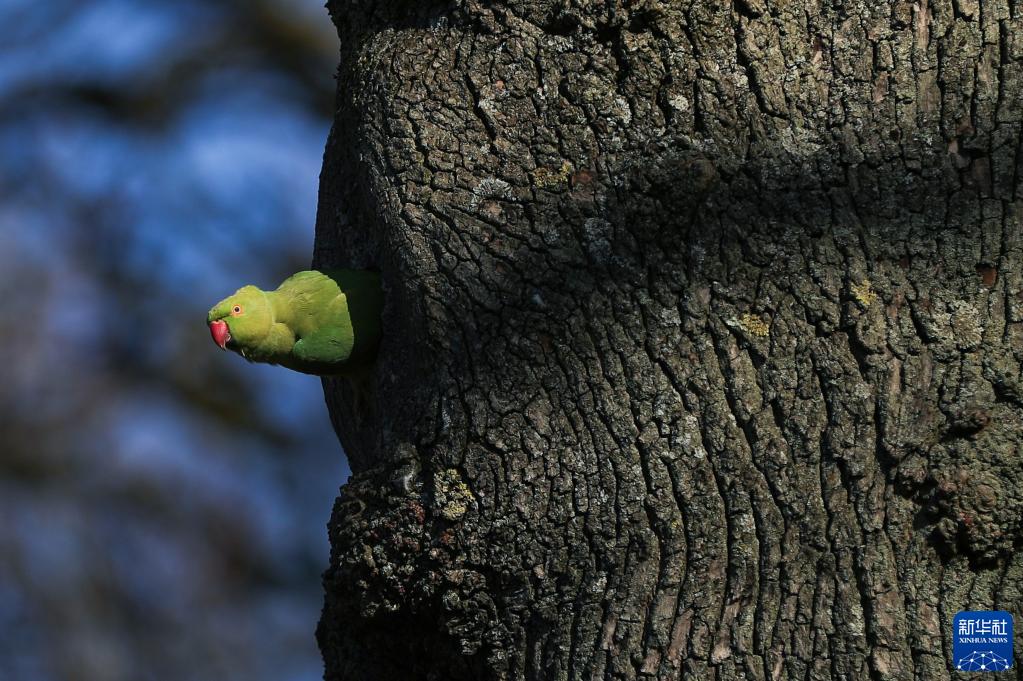 2022年3月7日,比利時(shí)布魯塞爾正值早春時(shí)節(jié),一只鸚鵡從樹洞中探出頭。