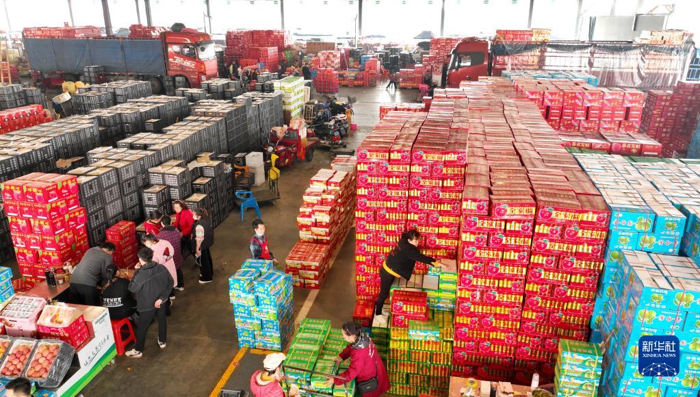 春節臨近,廣西柳州市各水果批發市場里一派繁忙景象,隨處可見工人裝卸水果的忙碌身影,商家籌備貨源,滿足節日市場供應。