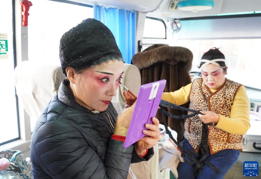 1月9日,在山東省鄆城縣黃集鎮,鄆城縣文化館戲曲演員趙愛榮(左)在面包車內的臨時化妝間化妝。