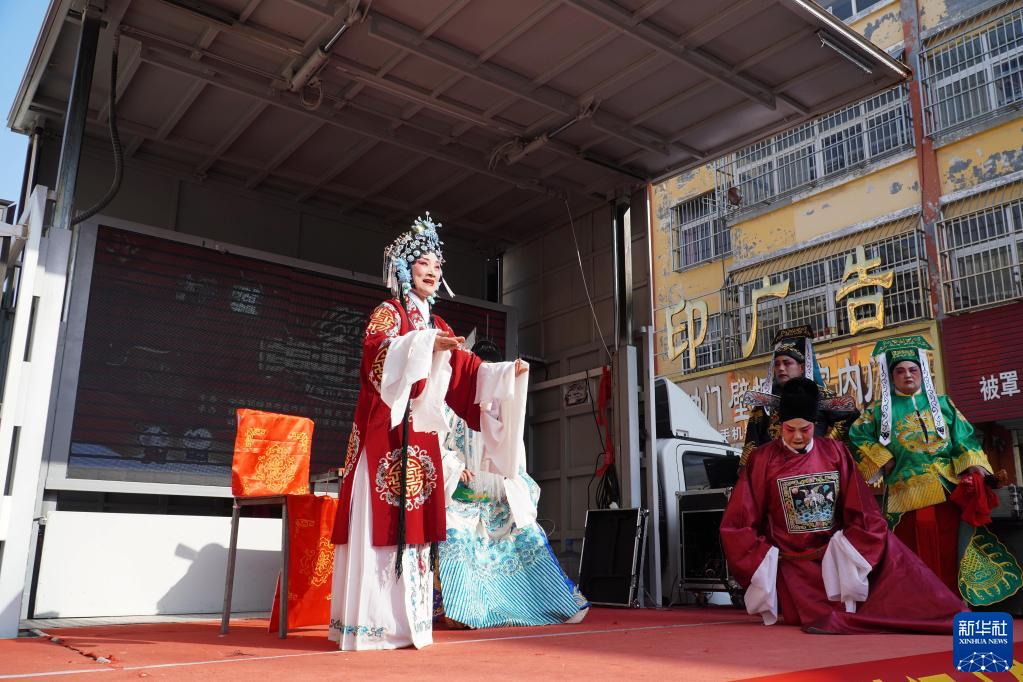 1月9日,在山東省鄆城縣黃集鎮(zhèn)舉行的送戲下鄉(xiāng)演出活動(dòng)上,鄆城縣文化館的戲曲演員在表演傳統(tǒng)地方戲曲劇種山東梆子。