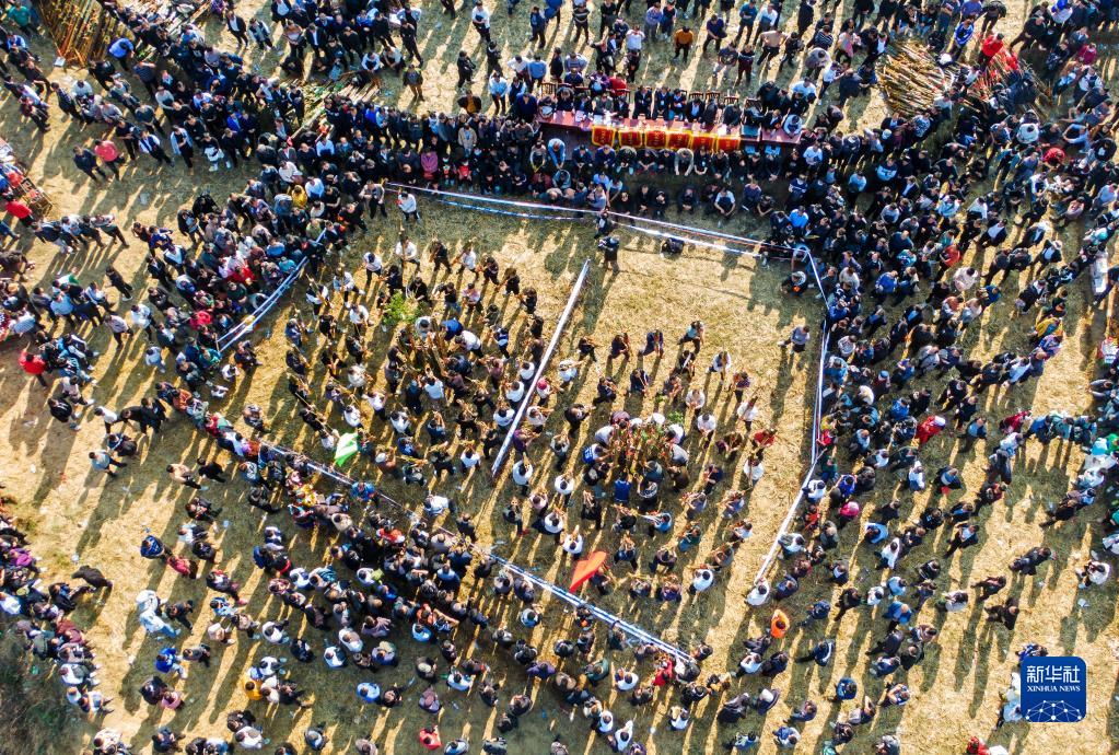 1月9日,在融水縣良寨鄉(xiāng),人們觀賞蘆笙比響活動(無人機(jī)照片)。