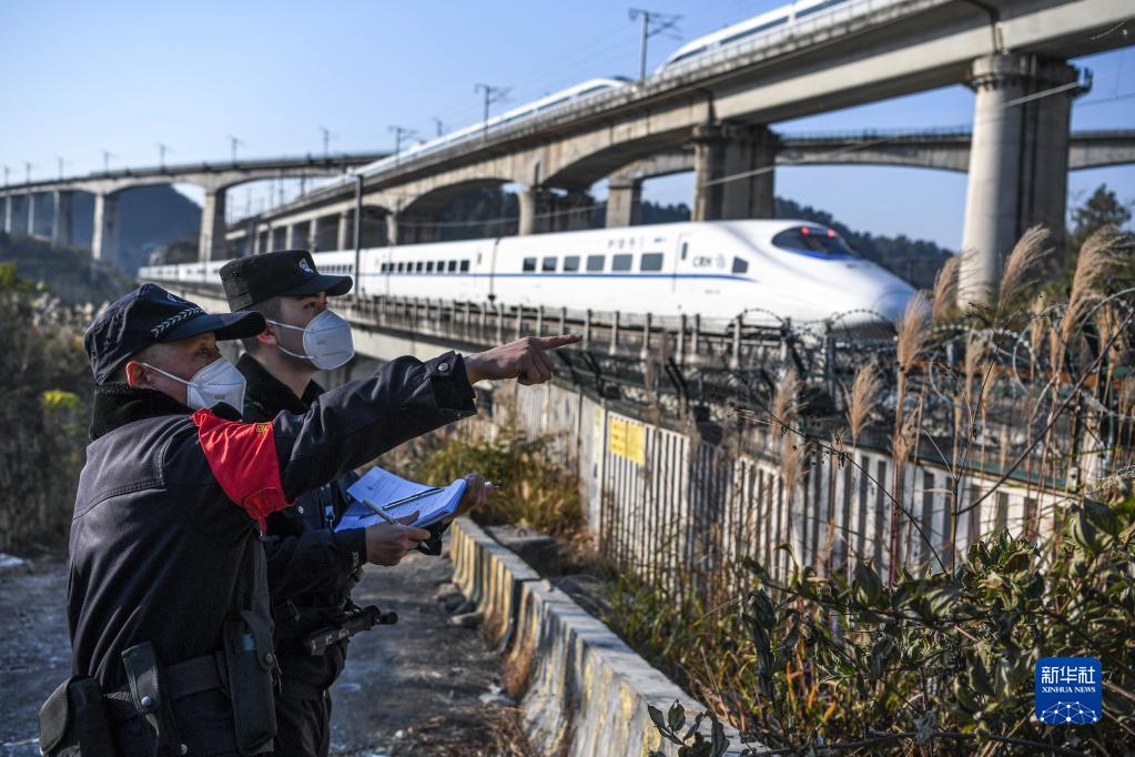 1月8日,鐵路警察王云(左)和謝源在鐵路沿線進行線路安全巡查。