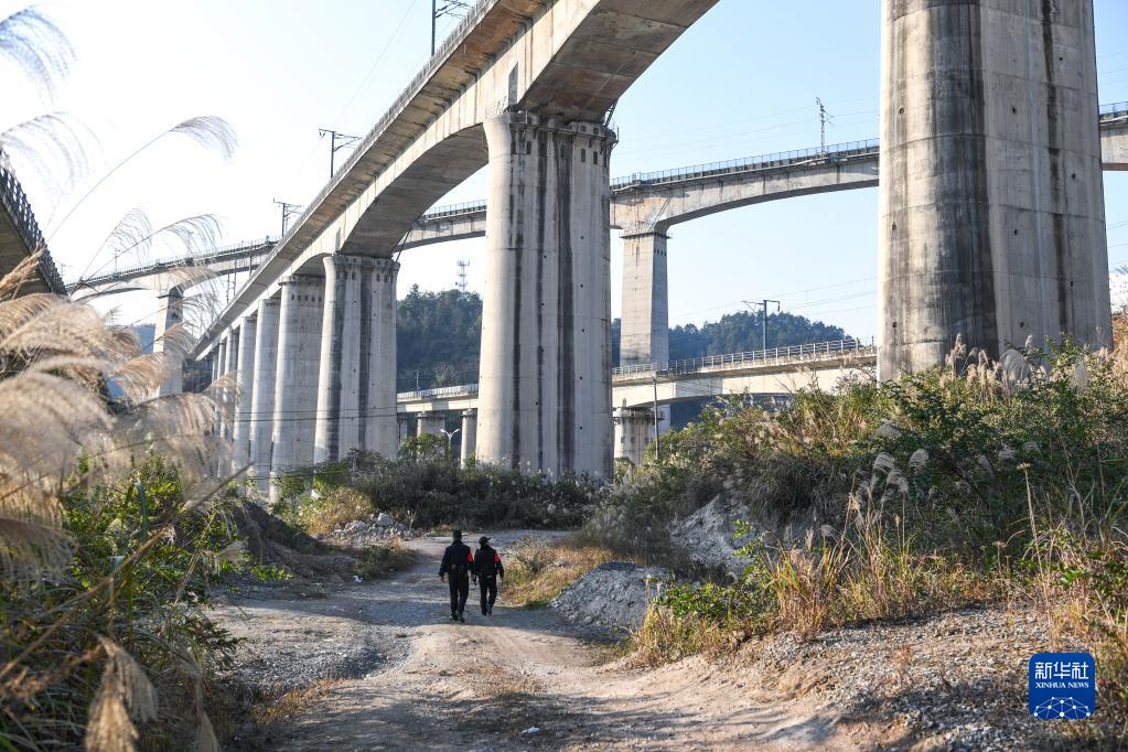 1月8日,鐵路警察王云(右)和謝源在鐵路沿線進(jìn)行線路安全巡查。