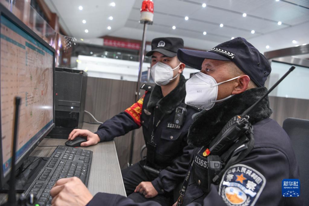 1月8日,鐵路警察王云(右)和謝源在貴陽東站核對進站乘客身份信息。