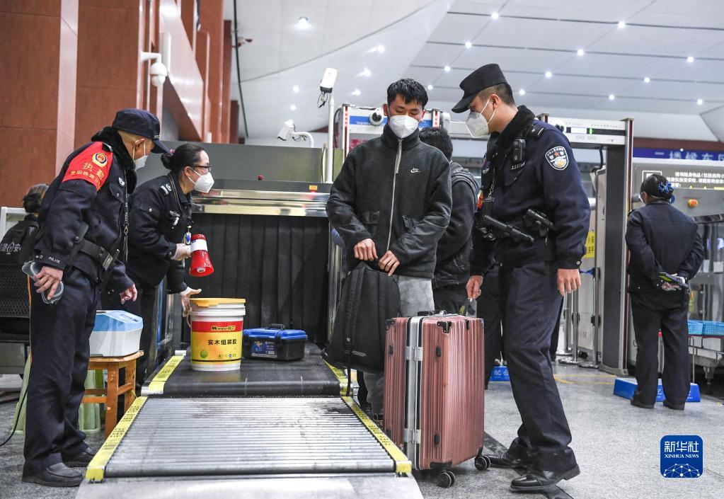 1月8日,鐵路警察王云(前左一)和謝源(前右一)在貴陽東站督導乘客進站安檢情況。