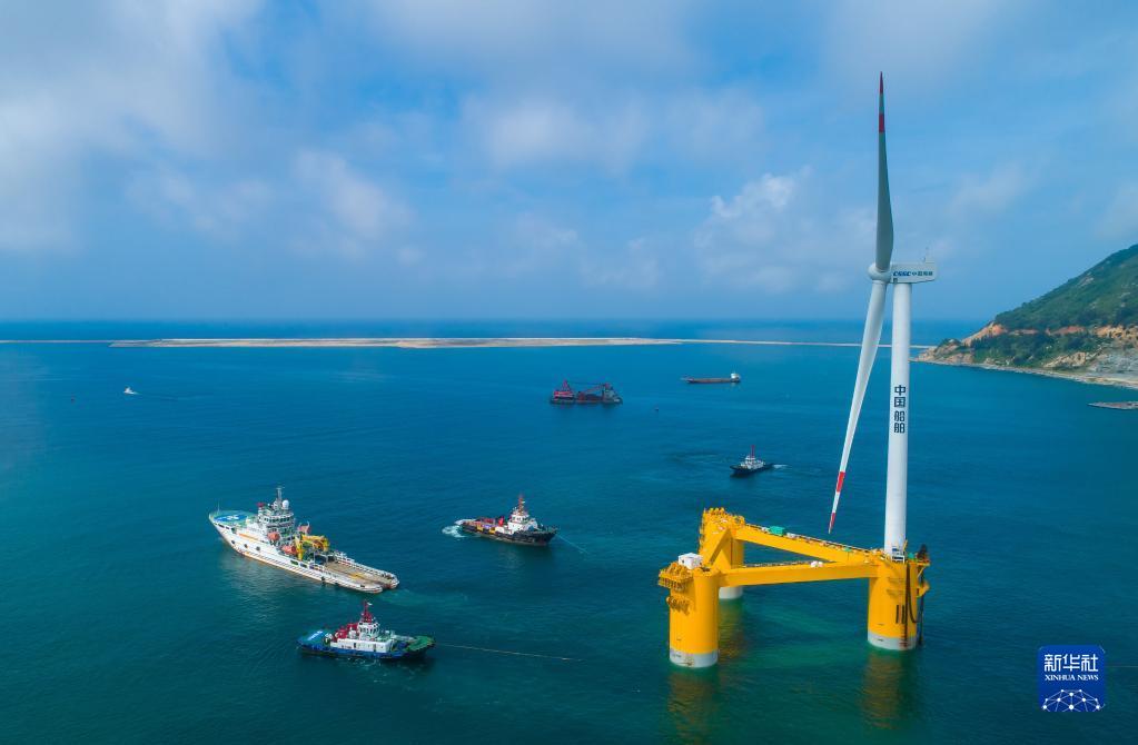 2022年5月29日,國內首臺深遠海浮式風電裝備“扶搖號”從廣東省茂名市廣港碼頭拖航前往羅斗沙海域進行示范應用(無人機照片)。
