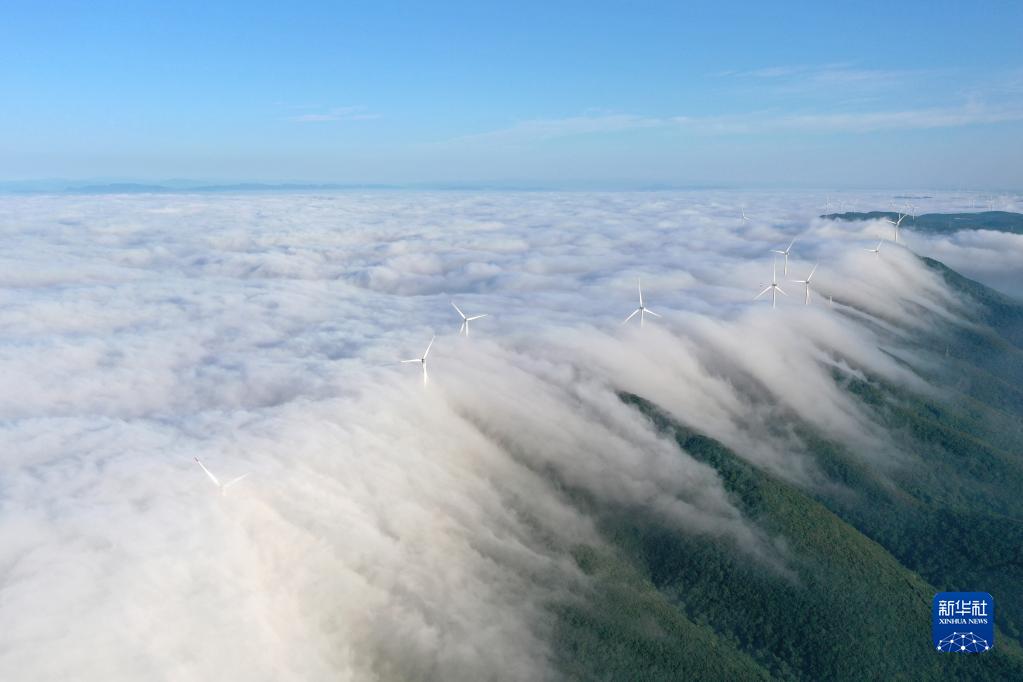 2022年5月29日,湖北省荊門市城郊圣境山現壯觀的瀑布云景觀,風機在云中若隱若現(無人機照片)。