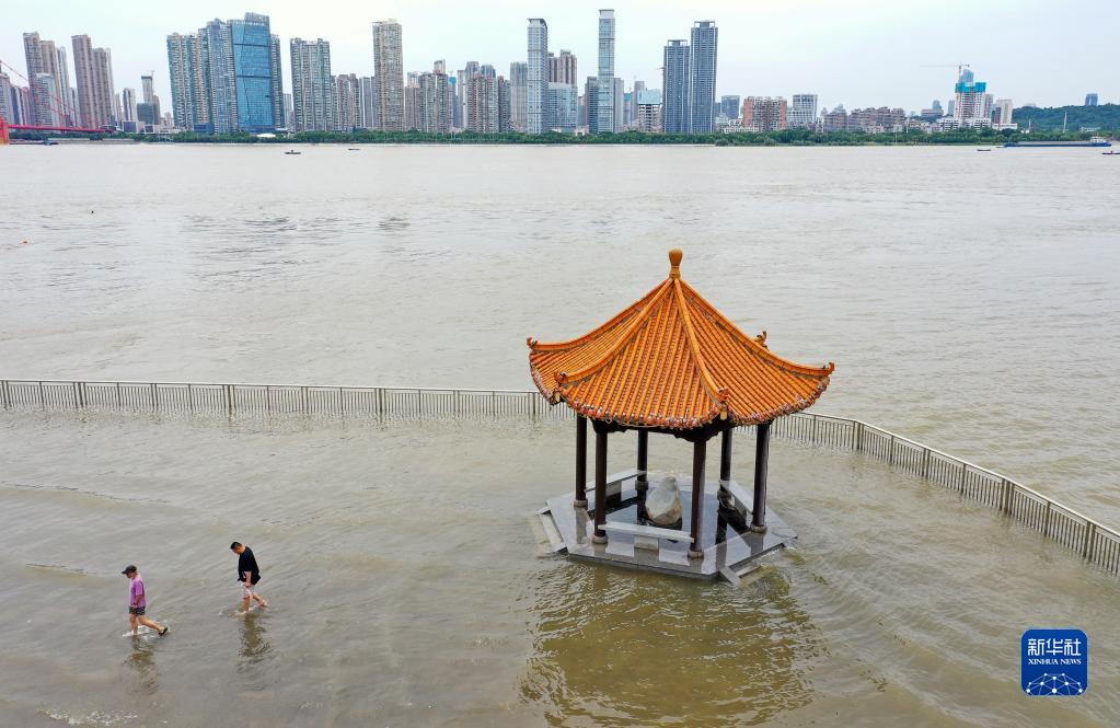2022年6月11日,兩名市民離開湖北武漢武昌區(qū)江灘黃花磯涼亭(無人機照片)。長江武漢段水位多日持續(xù)上漲,逼近武漢長江防汛25米設(shè)防水位。