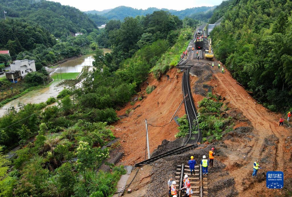 2022年6月14日,在位于龍巖市長汀縣的贛龍線金峰山站至長汀站區(qū)間路堤塌陷現(xiàn)場,鐵路部門組織搶險修復(fù)水害地段(無人機(jī)照片)。福建多地連日出現(xiàn)持續(xù)強(qiáng)降雨,位于閩西的龍巖市遭遇多輪局地性、突發(fā)性極端暴雨天氣,造成不同程度受災(zāi)。